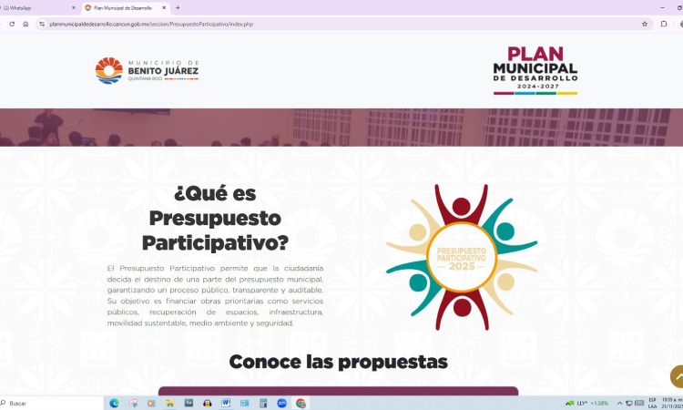 De la misma manera, Sosa Osorio indicó que la votación es a través de la página oficial del Ayuntamiento www.cancun.gob.mx, o del portal oficial: https://presupuestoparticipativo.cancun.gob.mx/smdsye/convocatoria/propuestas, donde podrán elegir los proyectos que beneficien a cada uno de las y los ciudadanos.