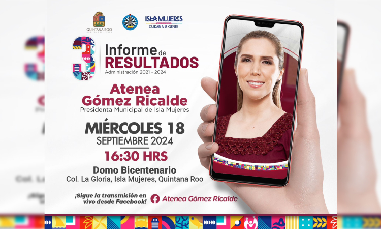 Isla Mujeres, Quintana Roo, 11 de septiembre de 2024.- La Presidenta Municipal de Isla Mujeres, Atenea Gómez Ricalde, invitó a las y los habitantes del municipio al acto donde rendirá su Tercer Informe de Resultados, evento que se realizará el próximo miércoles 18 de septiembre a las 16:30 horas en el Domo Bicentenario de la colonia La Gloria, de la Zona Insular.