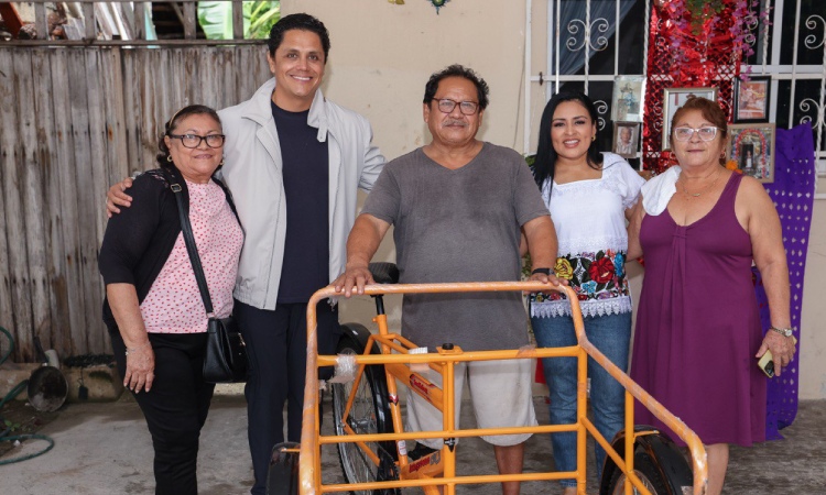En la colonia Zetina Gasca, entregó un triciclo de carga a don José Martín Araujo, para facilitar el traslado de materiales y entregas de su carpintería, contribuyendo así al fortalecimiento de su economía familiar.