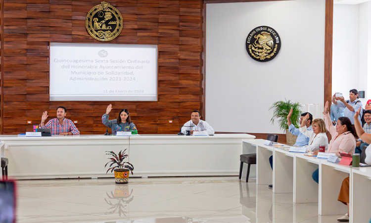 Playa del Carmen, Solidaridad, 11 de enero de 2024.- Durante la Quincuagésima Sexta Sesión Ordinaria de Cabildo del Ayuntamiento de Solidaridad, encabezado por la presidenta Lili Campos, se aprobó el uso del lema “2024 Año del 50 aniversario del Estado Libre y Soberano de Quintana Roo”, que se utilizará en papelería oficial, actos y eventos durante este año.