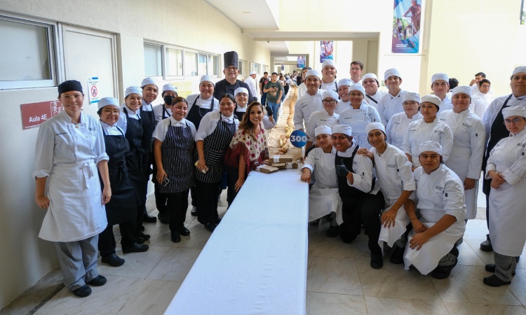 Cancún.- En el marco de la celebración del 25 aniversario de la creación de la Universidad del Caribe (UNICARIBE) Cancún, las y los alumnos de la carrera de Gastronomía prepararon la torta de cochinita más larga, de 300 metros, con el que esperan romper el récord Guinness.