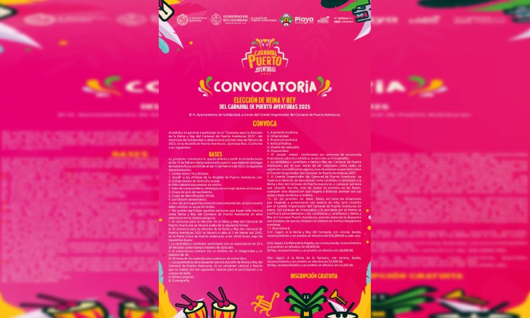Las convocatorias serán publicadas en las redes sociales del ayuntamiento de Solidaridad y de la alcaldía de Puerto Aventuras, así como en distintos espacios públicos, para que los ciudadanos puedan realizar su registro y participar en la elección de reyes y reinas del Carnaval en las categorías libre, juvenil, infantil y LGBTTTIQA+.
