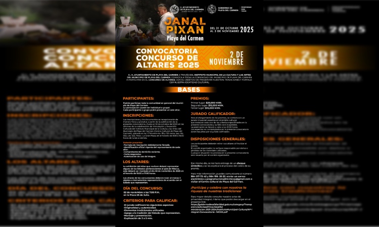 Playa del Carmen, Quintana Roo, 22 de octubre de 2025.- El Instituto Municipal de la Cultura y las Artes de Playa del Carmen invitó a las familias playenses a participar en los diversos concursos que se llevarán a cabo en el marco de las festividades del Janal Pixan 2025, con una bolsa en premios de casi 200 mil pesos.
