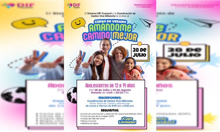 Cozumel, Quintana Roo, a 16 de julio de 2025. – Como parte del compromiso con el bienestar emocional y el desarrollo integral de las juventudes, la presidenta honoraria del Sistema DIF Cozumel, Diana Sosa Blanco, invita a las y los adolescentes de la isla a participar en el curso de verano “Amándome camino mejor”, organizado a través de la Coordinación de Centro Vive Diferente.