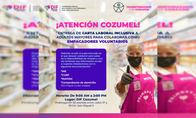 Cozumel, Quintana Roo, a 15 de diciembre de 2025.– Con el compromiso de fomentar un modelo económico más justo, incluyente y competitivo, el Gobierno Municipal que encabeza José Luis Chacón, junto al Sistema DIF Cozumel que preside Diana Sosa Blanco, a través de la Coordinación de Inclusión, pone a disposición de las personas adultas mayores la Carta Laboral Inclusiva para colaborar como empacadores voluntarios en supermercados de la isla.