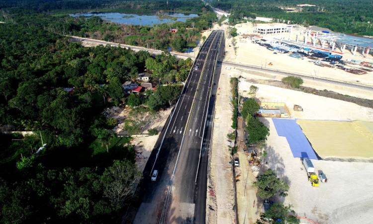 Por este puente nuevo confluirán quienes vengan de la carretera federal 186 y la 307 y pasarán por encima de las vías del Tren Maya, cuya estación es visible desde el lugar. Además, concluyó la sustitución del acueducto de la CAPA que suministra el 20% del agua potable que se consume en la ciudad.