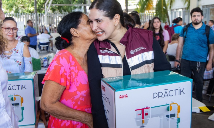 Playa del Carmen, Quintana Roo, 3 de diciembre de 2025.— La presidenta municipal Estefanía Mercado visitó este miércoles el módulo instalado por la Secretaría del Bienestar (Sebien) para supervisar la entrega de máquinas de coser de la Fábrica de Artes y Oficios (Faro), paquetes alimentarios del programa “Comemos Todos” y afiliación al programa “Salud Sin Tanto Choro”, una iniciativaque acerca atención médica directa, rápida y sin trámites complicados a las familias playenses.