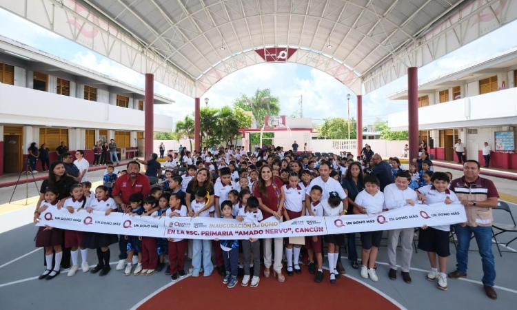 Cancún.- Para que más de mil alumnas y alumnos de la escuela primaria “Amado Nervo” de la supermanzana 256, tengan un espacio seguro y funcional en donde realizar sus actividades deportivas, culturales, cívicas y recreativas protegidos de las inclemencias del clima, la gobernadora Mara Lezama Espinosa entregó un domo nuevo recién construido.