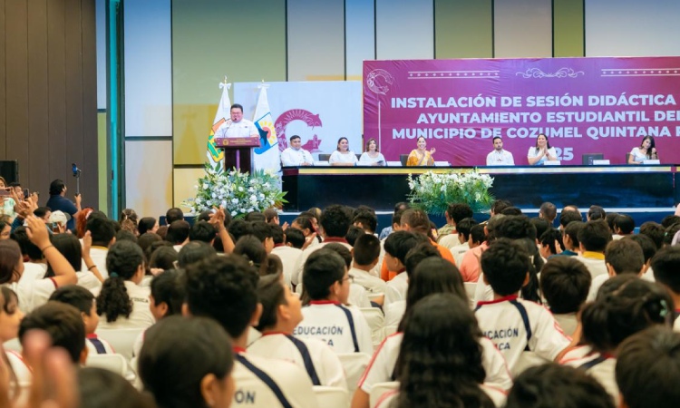 Cozumel, 10 de diciembre del 2025. – “Luchen por sus sueños, exploren con disciplina, responsabilidad y aporten ideas frescas para el bienestar de la comunidad… Como siempre lo he dicho, si ustedes tienen un buen presente, Cozumel tendrá un mejor futuro”, expresó el Presidente Municipal, José Luis Chacón Méndez al instalar la Sesión didáctica del Ayuntamiento Estudiantil 2025 en el Centro de Convenciones de la Isla.