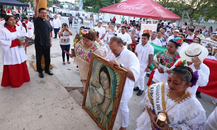 La procesión de trabajadores municipales y vecinos partió del edificio de la delegación entre “voladores” y acompañada de la Orquesta Jaranera Gameba, rodeó el parque principal y se dirigió a la iglesia de Nuestra Señora de Guadalupe, donde el Pbro. Ezequiel Buenfil Batún ofició una misa.
