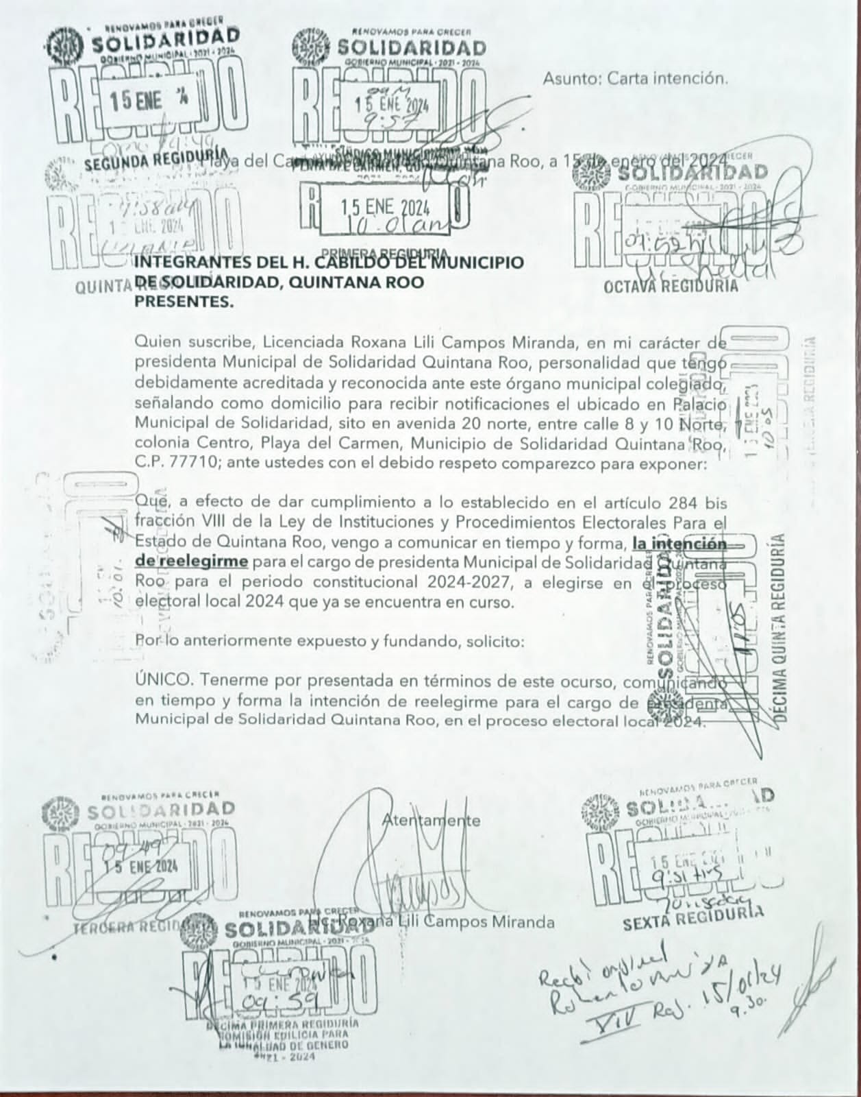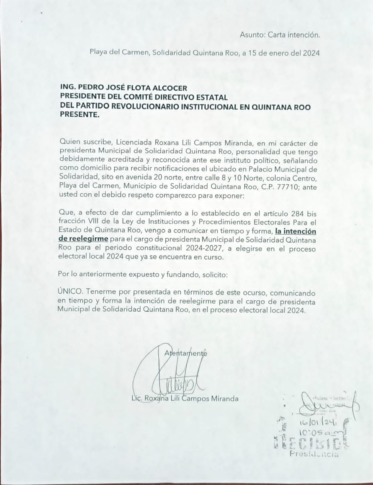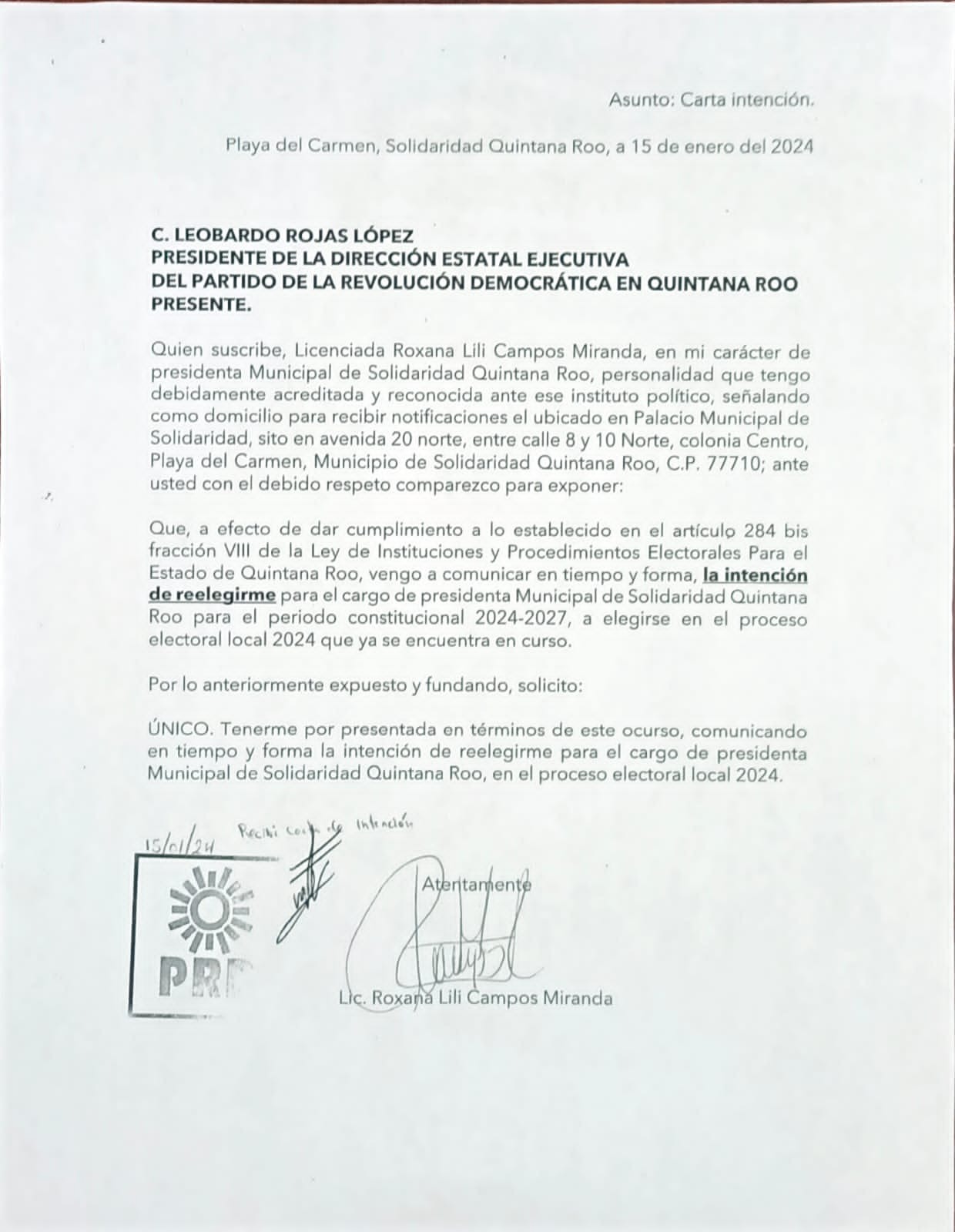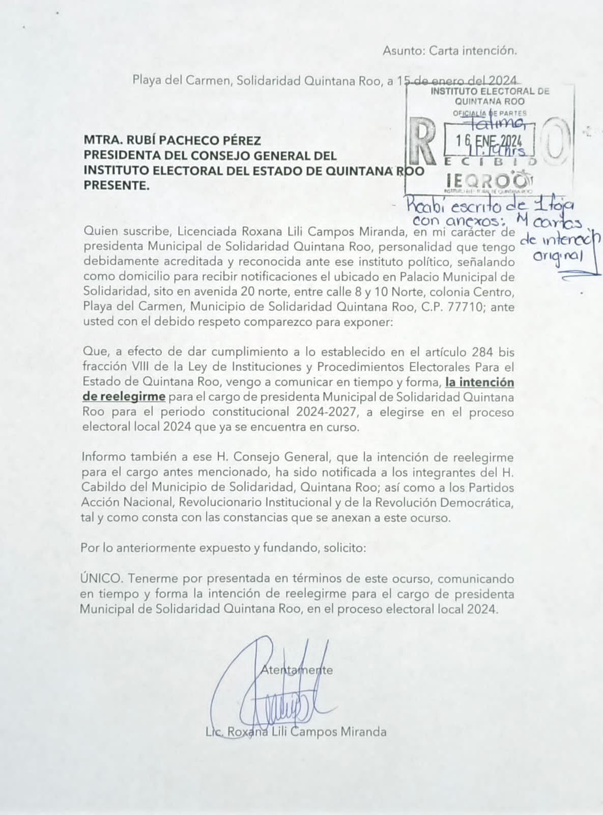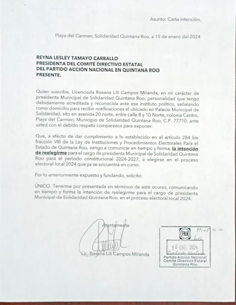 Mismo caso, lo notificó a Rubí Pacheco Pérez, presidenta del Consejo General del Instituto Electoral del Estado de Quintana Roo, su deseo de la reelección, a efecto de cumplir con el artículo 284 bis fracción VIII de la Ley de Instituciones y Procedimientos Electorales.