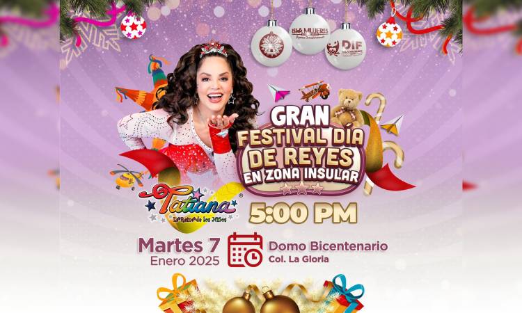 Isla Mujeres, Quintana Roo, 3 de enero de 2025. –Con el objetivo de fortalecer el tejido social y promover infancias felices, el Ayuntamiento de Isla Mujeres, encabezado por la Presidenta Municipal, Atenea Gómez Ricalde, invita a las familias de Isla Mujeres al Gran Festival de Día de Reyes, con la presentación estelar de Tatiana “La Reina de los Niños”.